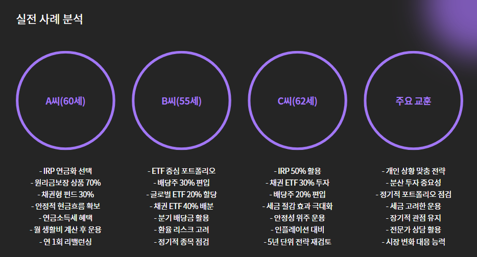 | A씨(60세, 퇴직자) | IRP 연금화 + 원리금보장 | 안정적인 생활비 확보 |
