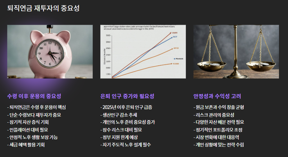 2025년 이후 은퇴 인구가 빠르게 증가하는 만큼, 퇴직금을 소비하지 않고 불릴 수 있는 재투자 전략에 대한 관심도 커지고 있습니다.