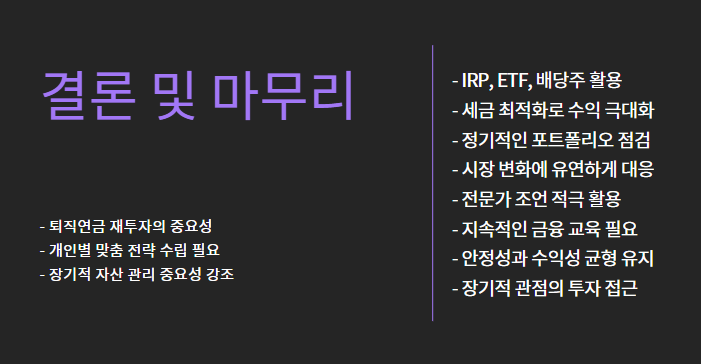 | C씨(62세, 연금 수령자) | IRP + 채권 ETF 혼합 | 세금 절감 + 안정성 확보 |