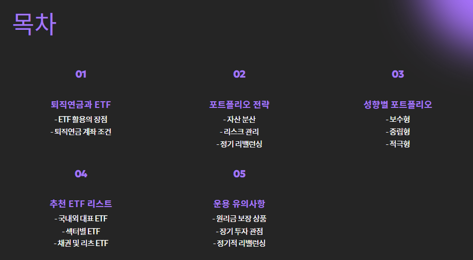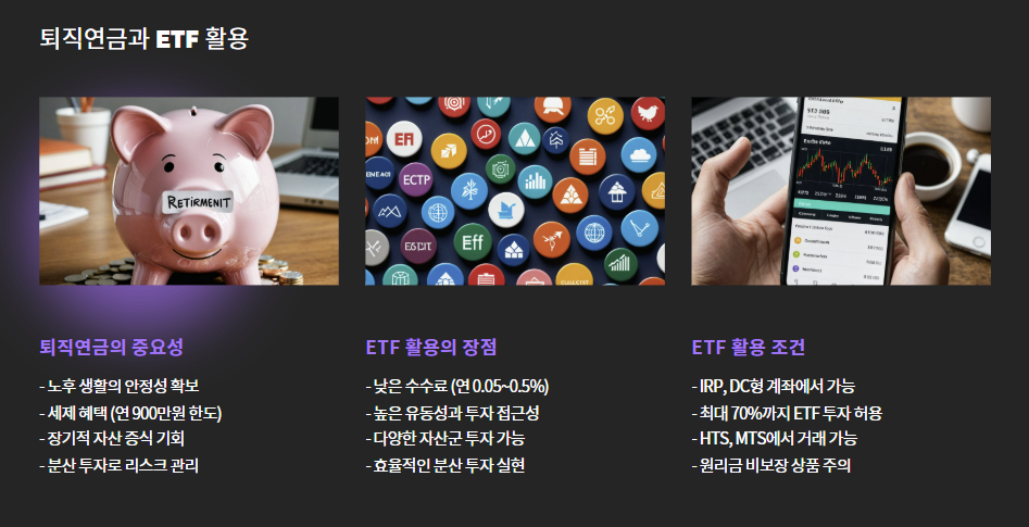 최근 많은 투자자들이 퇴직연금 계좌 안에서 **ETF(상장지수펀드)**를 활용하는데,