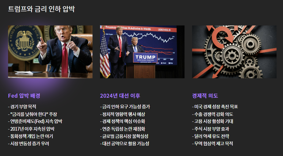 도널드 트럼프 전 미국 대통령은 재임 시절부터 줄곧 **연방준비제도(Fed)**를 향해 금리 인하를 강하게 압박해왔습니다.