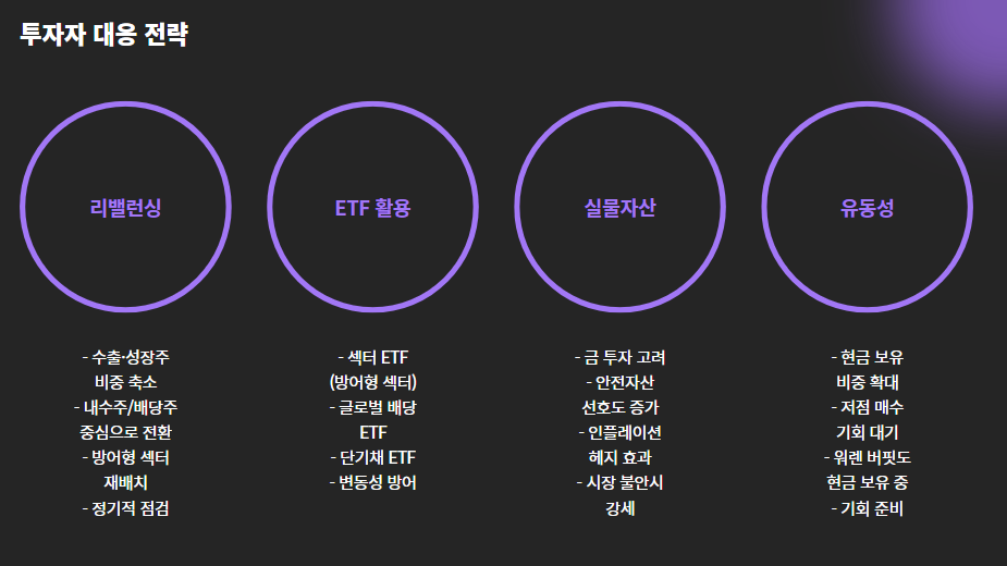 - 금, 글로벌 배당, 단기채 ETF 등 변동성 방어 자산 활용