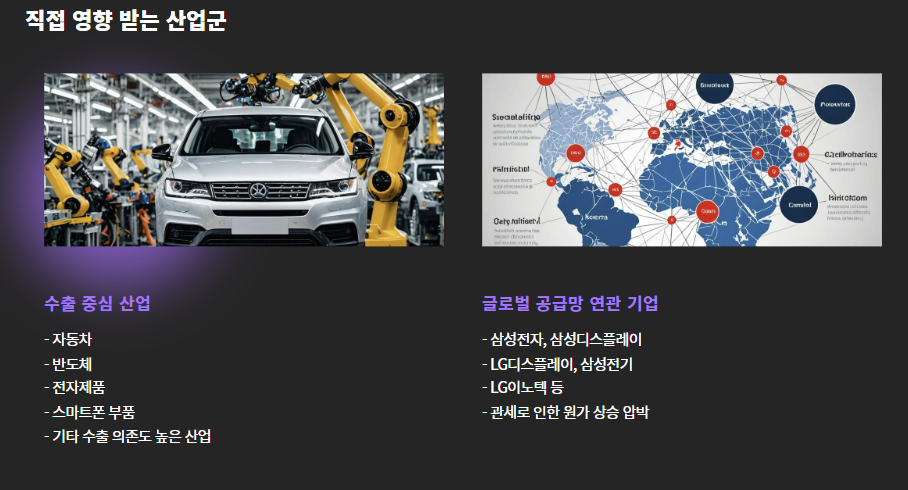 관세정책이 현실화되면, 다음과 같은 수출 중심 산업군이 타격을 받을 수 있습니다.