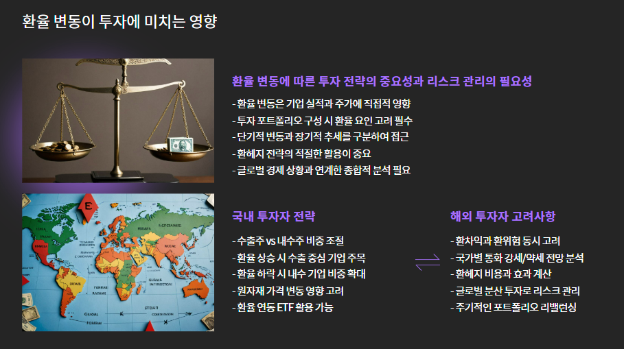 - 국내 투자자라면 환율 방향성을 파악해 수출주 vs 내수주 전략을 구분해야 하고,