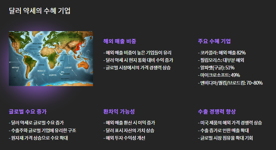 📈 달러 약세 + 글로벌 수요 증가 = 수출주 / 글로벌기업에 유리한 구조