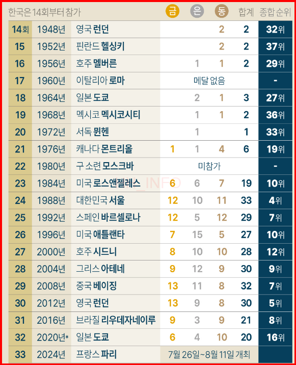 대한민국은 올림픽에서 꾸준히 좋은 성적을 기록해 왔습니다. 특히 서울 올림픽에서는 메달 33개를 획득하며 종합 4위를 기록했습니다. 이번 파리올림픽에서도 이미 도쿄와 리우데자네이루 순위를 넘어서고 있어, 역대 최고의 성적을 기대해볼 수 있습니다.