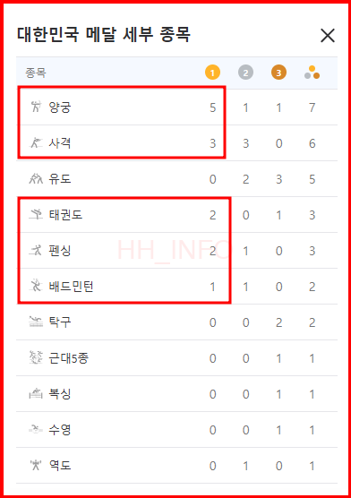 이번 올림픽에서 대한민국은 총 5개 종목에서 13개의 금메달을 획득했습니다. 양궁에서 5개, 사격에서 3개, 펜싱에서 2개, 태권도에서 2개, 그리고 배드민턴에서 1개의 금메달을 따냈습니다. 양궁과 사격은 전통적으로 강세를 보이는 종목이었지만, 특히 이번 올림픽에서는 새로운 얼굴들이 등장하며 국민들에게 큰 감동을 안겨주었습니다.