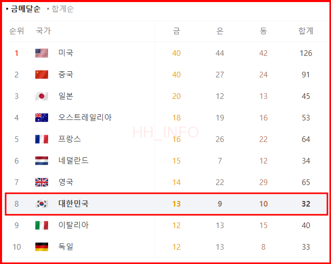 2024년 파리 올림픽이 드디어 막을 내렸습니다. 대한민국은 이번 올림픽에서 금메달 13개, 은메달 9개, 동메달 10개로 총 32개의 메달을 획득하며 최종 순위 8위에 올랐습니다. 이는 예상을 훌쩍 뛰어넘는 성과로, 2008년 베이징 올림픽과 2012년 런던 올림픽에서 기록한 13개 금메달과 타이 기록을 세우며 역대 최고의 성적을 다시 한번 재현했습니다.