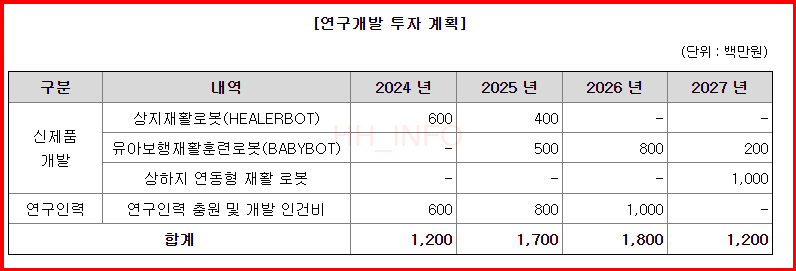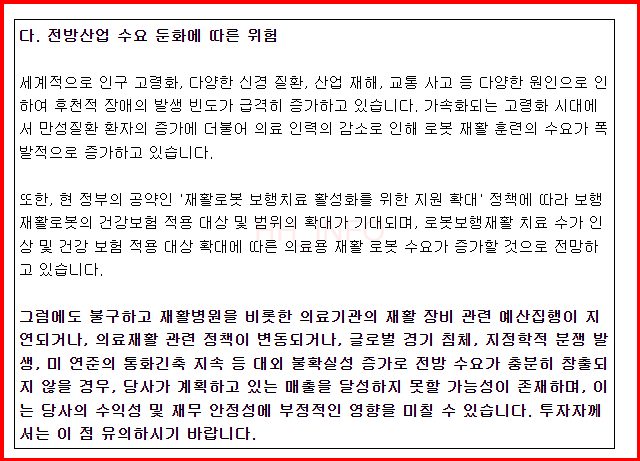 - 장기 계획: 보유기술을 활용해 재활기기, 의료 플랫폼, 로봇 서비스 등 의료로봇 시장 전반으로 확대