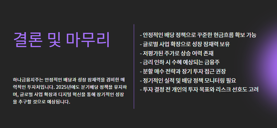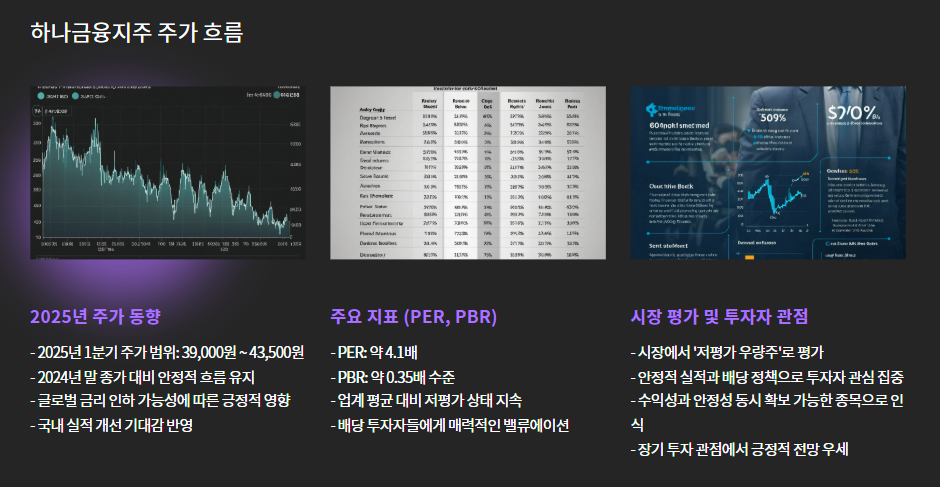 시장에서는 하나금융을 여전히 저평가 우량주로 보고 있습니다. 특히 배당을 중심으로 접근하는 투자자들에게는 수익과 안정성 두 마리 토끼를 잡을 수 있는 종목으로 평가받고 있죠.