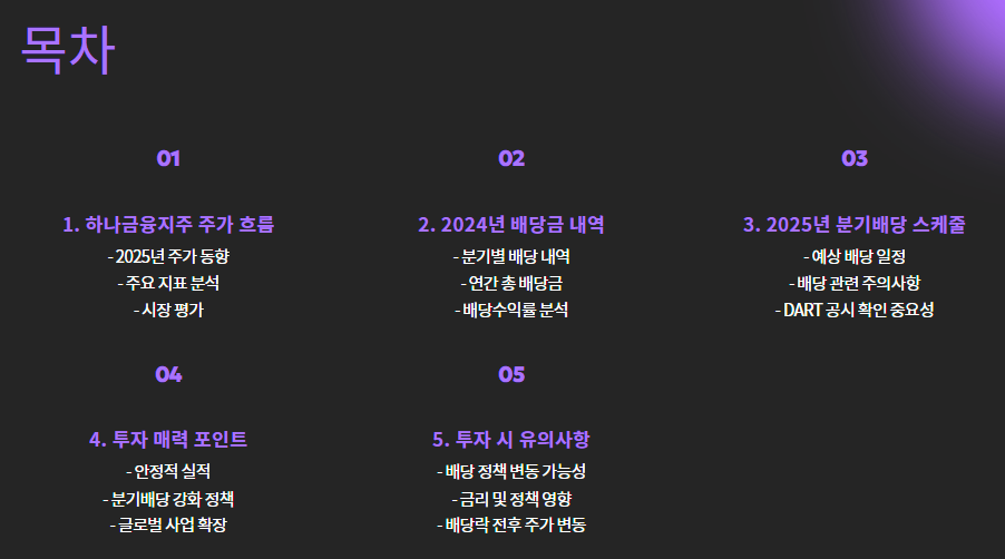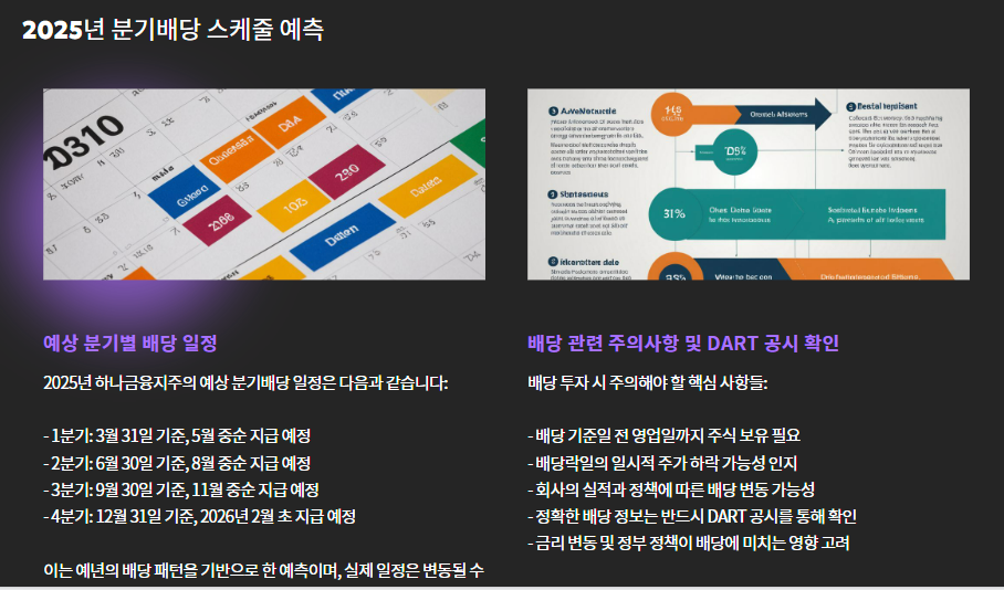 2025년에도 하나금융은 분기배당 정책을 유지할 가능성이 높습니다. 예년 흐름을 바탕으로 예상 배당일정을 정리하면 다음과 같습니다:
