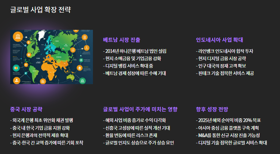 게다가, 하나금융은 글로벌 사업(베트남, 인도네시아, 중국 등) 확장도 적극적이라 주가 상승 여력까지 기대해볼 수 있습니다.