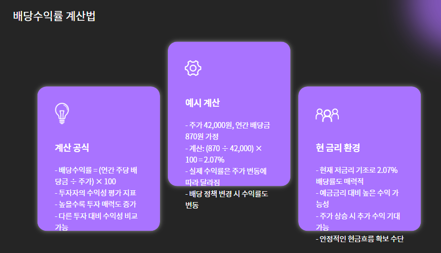 - 2024년 기준 배당수익률: 약 2.1%~2.3% (평균 주가 기준)