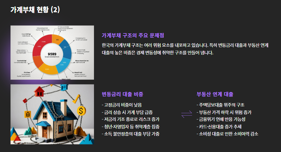 | 고정금리 비중 낮음 | 변동금리 대출이 많아 금리 인상 시 충격 큼 |