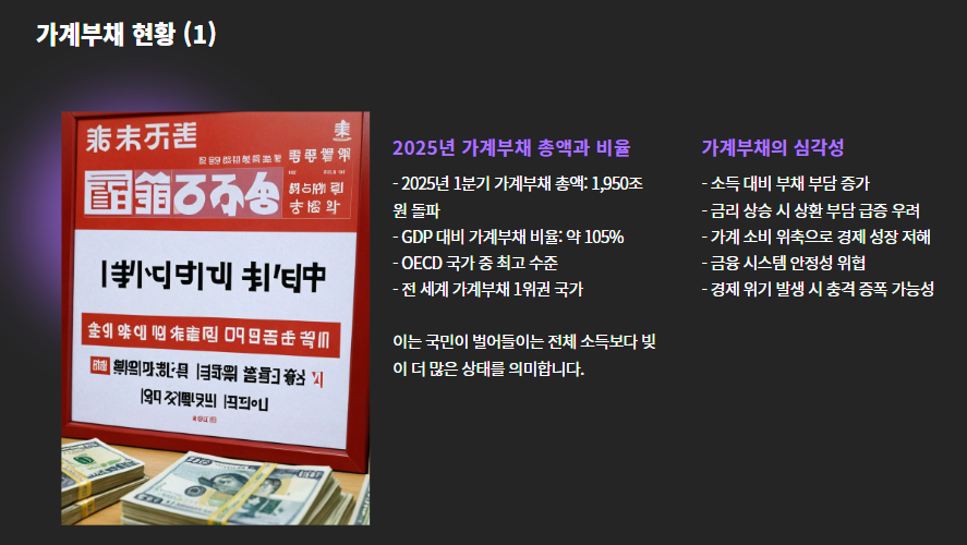 - 2025년 1분기 기준 가계부채 총액: 1,950조 원 돌파