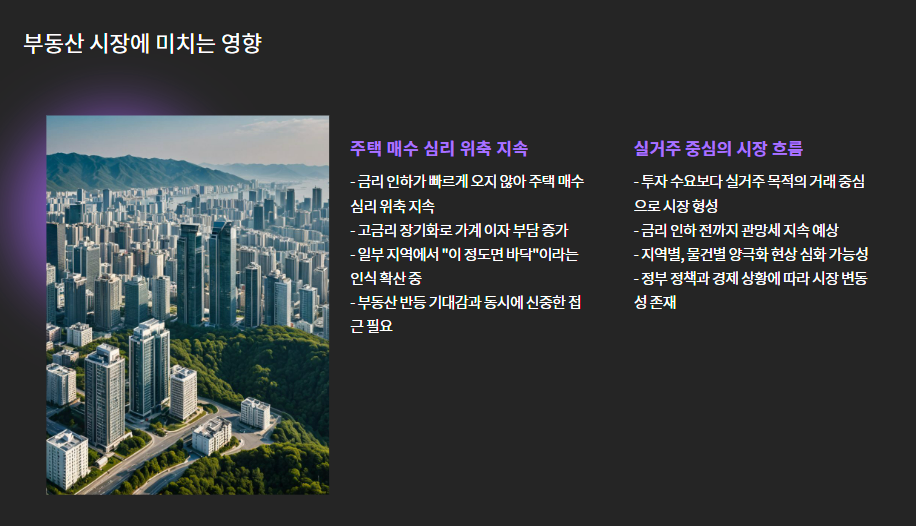 - 금리 인하가 빠르게 오지 않으면 주택 매수 심리 위축 지속