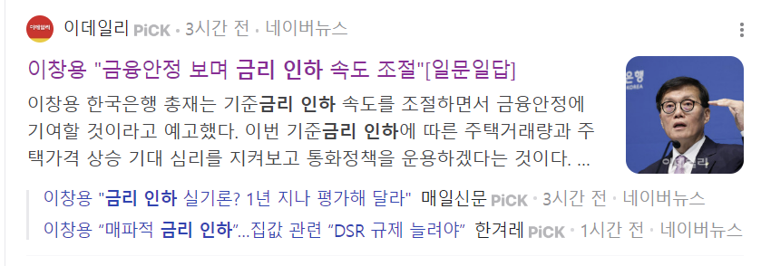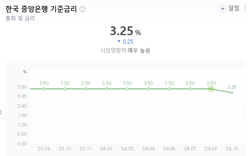 - 한미 금리 차이: 이번 인하로 인해 한국과 미국 간 금리 격차는 1.25%로 좁아졌습니다. 미국이 금리를 큰 폭으로 낮추며 한미 간 금리차 조정이 필요해진 것이 이번 결정의 요인으로 분석됩니다.