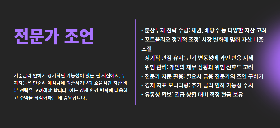 “지금은 단순히 예적금보다 자산을 효율적으로 나누는 전략이 중요한 시점입니다. 기준금리 인하가 장기화될 가능성이 있는 만큼, 분산투자와 포트폴리오 조정이 필요하죠.”