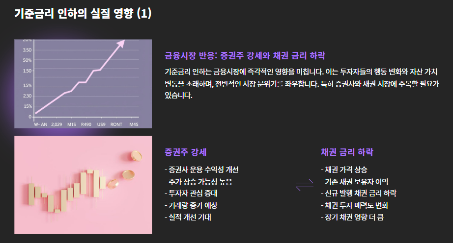 - 증권주 강세: 금리 인하는 증권사들의 운용 수익성과 연관되므로, 주가 상승으로 이어지는 경우 많음