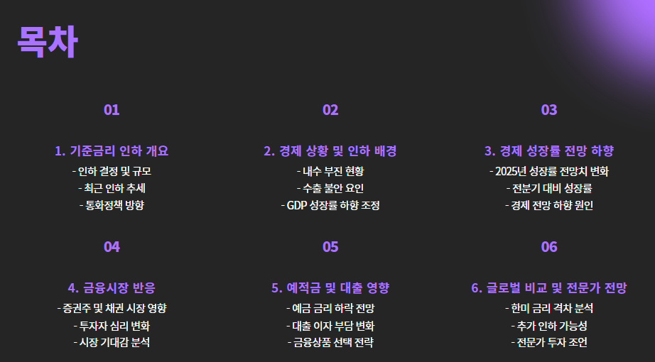 | 금리 인하 이유 | 내수 부진, 수출 둔화, 경기 부양 필요 |