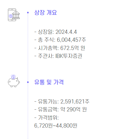 ➡ 상장일 유통물량이 43%가 넘는 수준으로, 다소 높은 편입니다. 따라서 시초가 형성 이후 차익 실현 매물이 나올 가능성도 염두에 두셔야겠죠.
