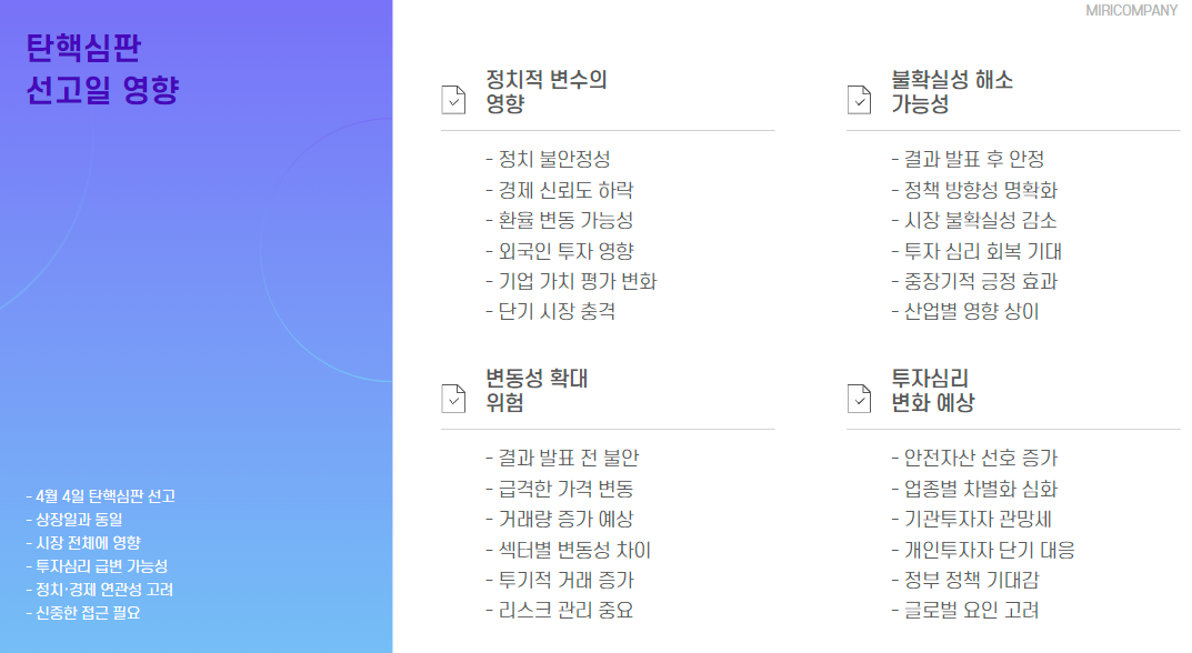 4월 4일은 단순한 상장일이 아닙니다. **정치적 변수(탄핵심판 선고)**까지 겹친 날이기도 해요. 이런 중대한 이벤트는 시장 전체에 영향을 줄 수 있으므로, 그 결과에 따라 투자심리가 급변할 가능성도 염두에 두셔야 합니다.
