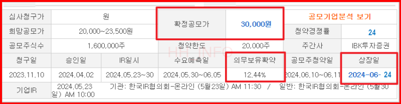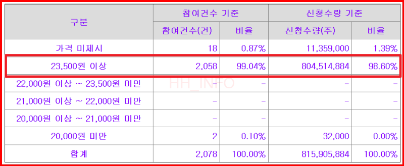 공모가는 상단을 넘어선 30,000원으로 결정되었습니다. 이는 상단 가격을 약 28% 초과한 금액입니다. 하지만 수요예측 결과에 비해 너무 높은 가격 설정이 아닌가 하는 우려도 있습니다. 참여기관 중 약 98%가 밴드 상단인 23,500원 이상의 금액을 써서 높은 참여율을 보였습니다.