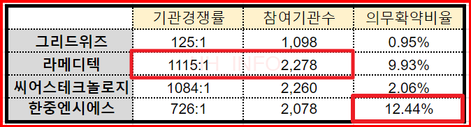 한중엔시에스의 공모주 수요예측 결과는 725.94:1입니다. 이는 올해 진행된 공모주들 중 중하위권에 속하는 결과입니다. 최근 진행된 그리드위즈보다 높고, 라메디텍과 씨어스테크놀로지보다는 낮은 경쟁률을 기록했습니다.