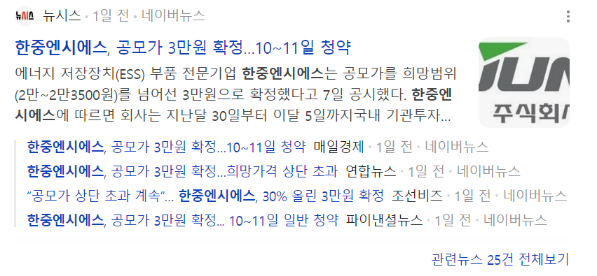 에너지저장장치(ESS) 부품 전문기업 한중엔시에스는 공모가에 대해 희망공모범위(2만~2만3500원)를 넘어선 3만원으로 확정했다고 공시했다. 8일 한중엔시에스에 따르면 지난달 30일부터 이달 5일까