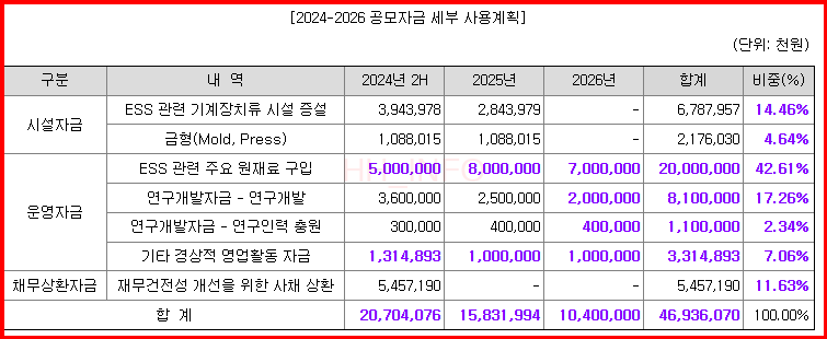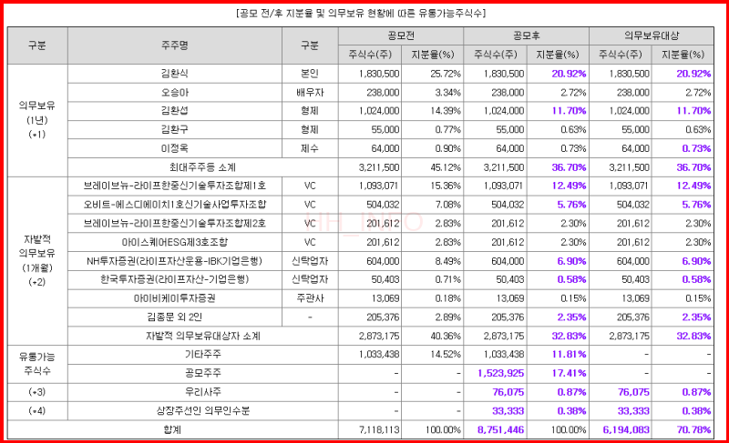 이번 IPO를 통해 유입된 자금은 회사의 기술 개발과 생산 설비 확장 등에 사용될 예정입니다. 총 상장 예정 주식 수는 8,751,446주이며, 공모가 기준 시가총액은 약 2,625억원입니다. 상장일에 유통 가능 주식 수는 2,557,363주로, 이는 전체의 약 29.22%에 해당합니다. 한중엔시에스의 주요 주주는 대표와 그의 가족들이며, 총 지분의 36.7%를 보유하고 있습니다.