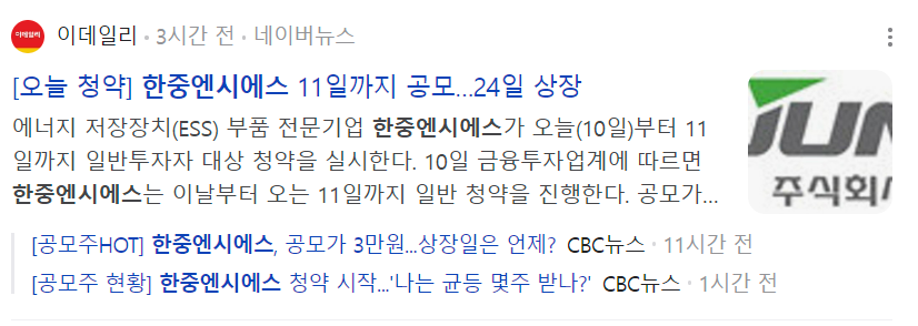 에너지 저장장치(ESS) 부품 전문기업 한중엔시에스가 오늘(10일)부터 11일까지 일반투자자 대상 청약을 실시한다. 10일 금융투자업계에 따르면 한중엔시에스는 이날부터 오는 11일까지 일반 청약