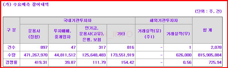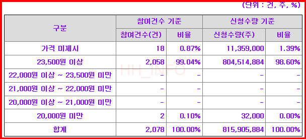 수요 예측 결과, 총 참여건수는 2,078건이고, 단순 경쟁률은 725.94:1이었어요. 희망 공모가 밴드는 20,000~23,500원이었는데, 대부분 23,500원 이상을 써냈어요. 결국 확정 공모가는 30,000원으로 결정되었고, 여기에 청약 수수료를 더하면 34% 올린 셈이네요.