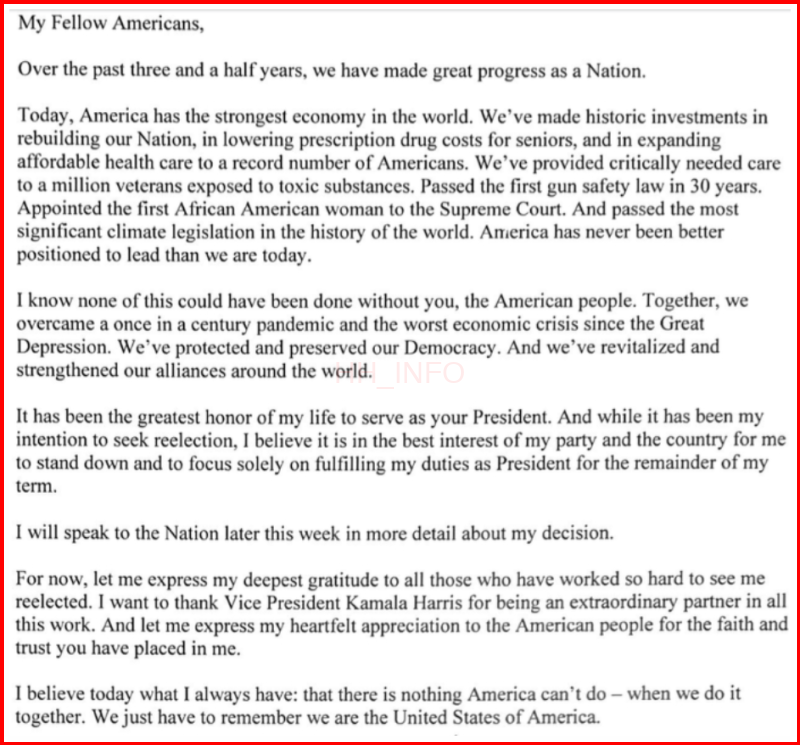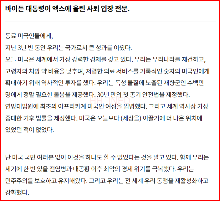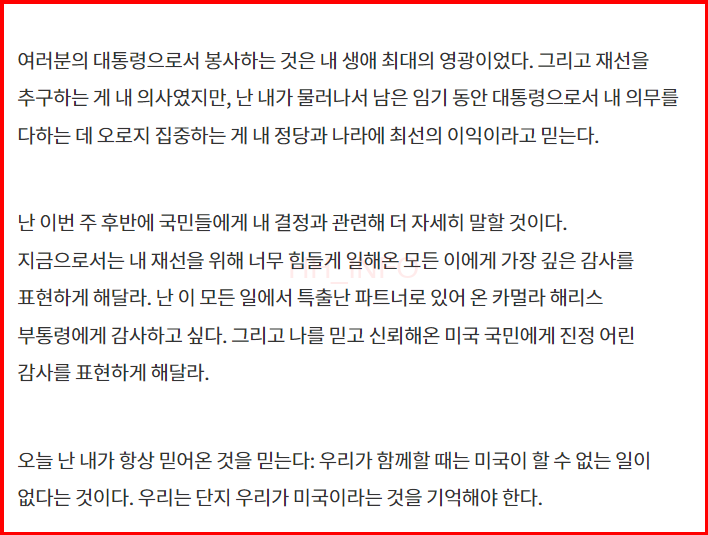 바이든 대통령의 사퇴와 관련된 입장 전문에서는 그간의 업적을 강조하며, 앞으로 남은 임기에 최선을 다하고 카멀라 해리스 부통령에게 대선 후보직을 넘긴다는 내용이 담겨 있습니다. 이는 민주당의 의도가 담긴 자화자찬의 성격이 강합니다.
