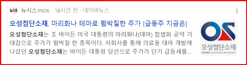 해리스의 대선 후보 지명 소식이 전해지자 한국의 마리화나 관련주도 주목받고 있습니다. 대표적인 종목으로는 오성첨단소재와 우리바이오가 있습니다.
