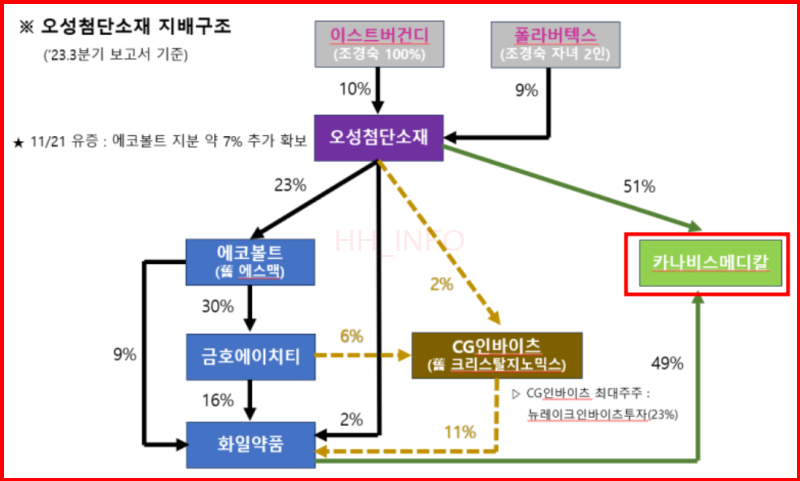 - 오성첨단소재: 기능성 필름 및 열차단 필름 회사지만 자회사로 의료용 대마 연구를 하는 카나비스 메디칼의 지분을 소유하고 있습니다.