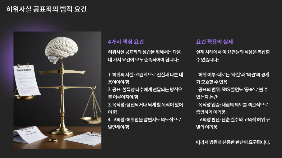 | 4. 고의성 | 단순 착오와는 구별됨. ‘거짓임을 알고도’ 발언 |