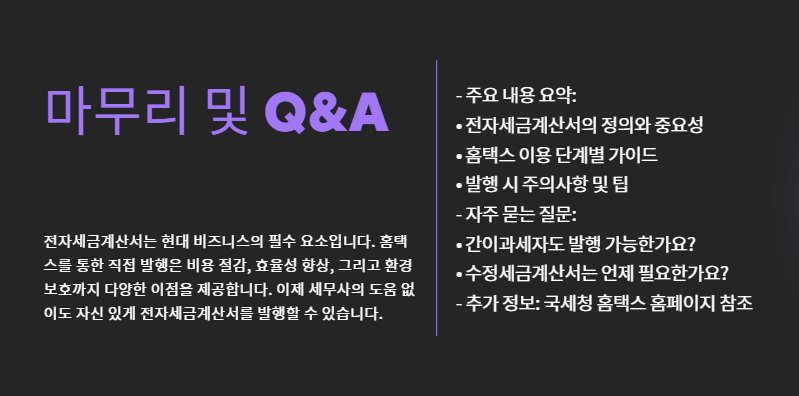 특히 프리랜서나 개인사업자는 홈택스를 통해 직접 발행함으로써 세무 비용도 절감하고, 거래처 신뢰도도 확보할 수 있습니다.