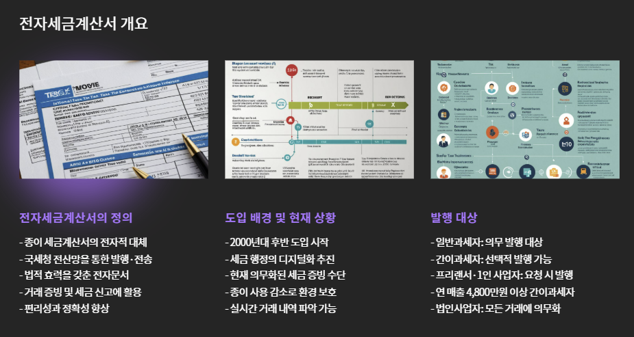 전자세금계산서는 종이로 발행하던 기존 세금계산서를 국세청 전산망을 통해 전자적으로 발행·전송하는 방식입니다.