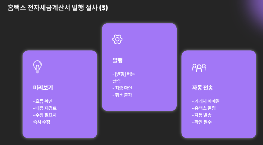 - 발행 완료 후, 거래처 이메일 또는 홈택스 알림으로 자동 전송됩니다.