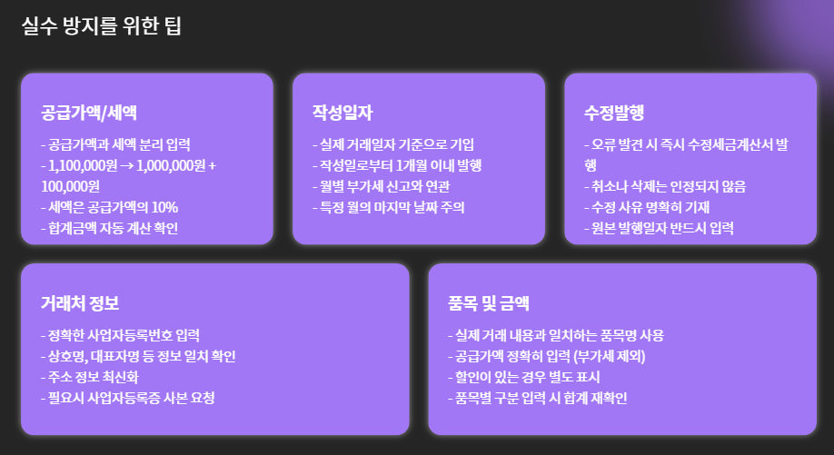 - 수정세금계산서: 금액 수정 또는 발행 오류 시 사용