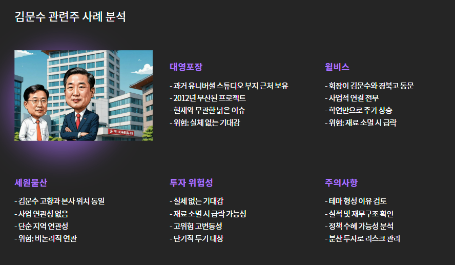 - 상승 이유: 김문수가 경기도지사 시절 추진한 ‘유니버셜 스튜디오’ 예정지 근처에 부지 보유