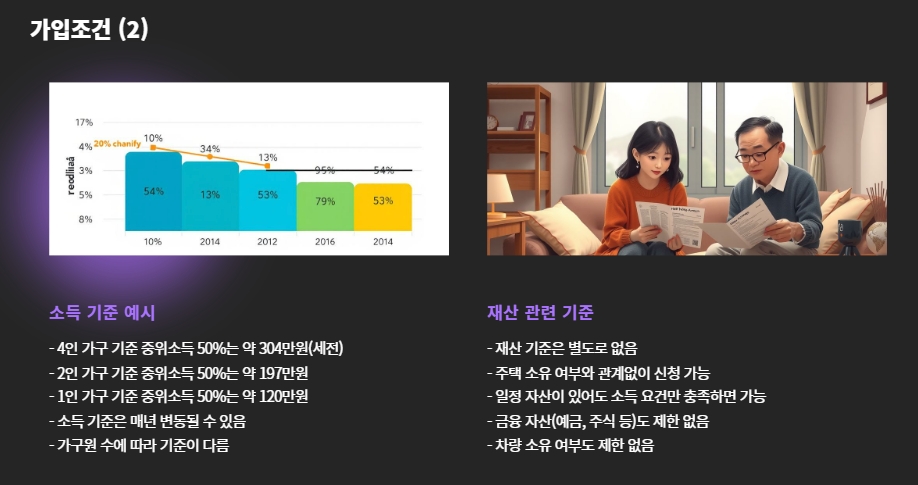 예를 들어, **4인 가구 기준 중위소득 50%는 약 304만 원(세전)**입니다. 이에 해당하면 가입 가능성이 높습니다.