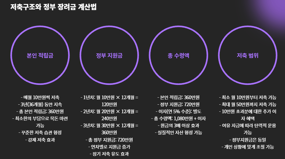 매달 10만 원씩 3년간 꾸준히 저축하면, **내가 낸 돈의 3배가 넘는 총 1,080만 원(원금 + 지원금)**을 받을 수 있는 제도입니다.