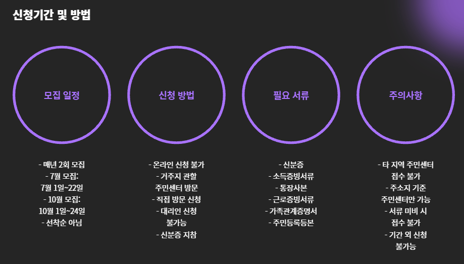 신청은 온라인이 불가능하며, 반드시 거주지 관할 주민센터에 직접 방문 신청해야 합니다.