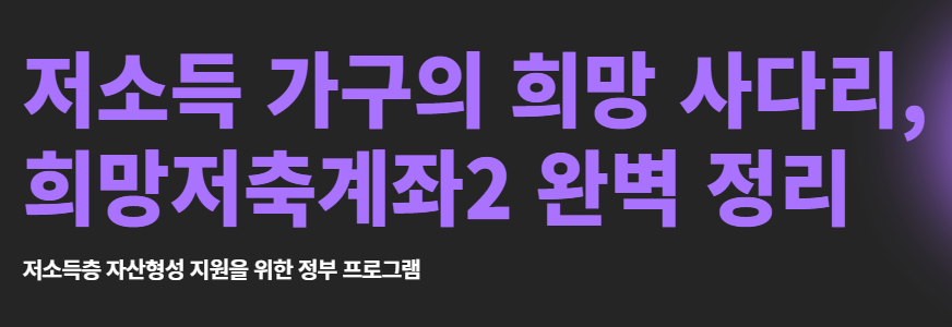 ‘희망저축계좌2’는 저소득 가구가 자립할 수 있도록 정부가 목돈 마련을 도와주는 자산형성지원사업입니다.