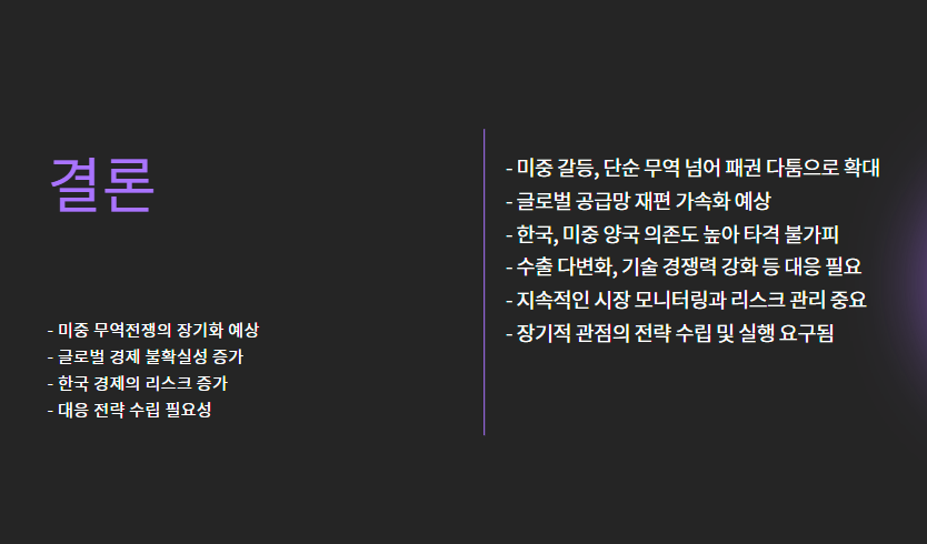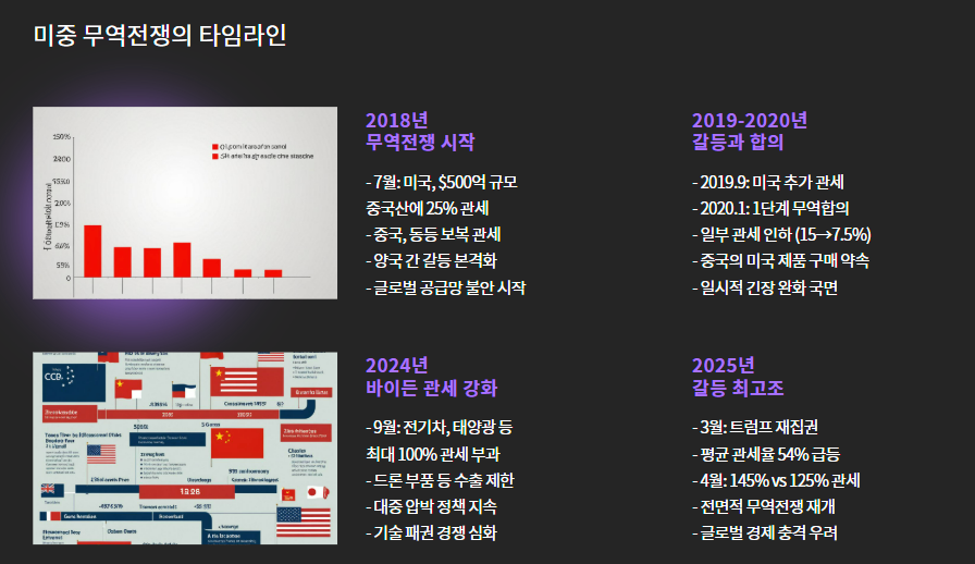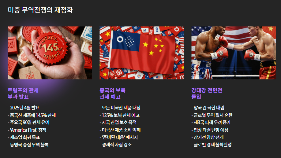 | 2025년 4월 | 갈등 최고조 | 중국산 전 품목에 145% 관세 | 미국산 전 품목에 125% 관세 |