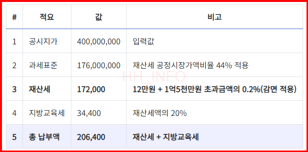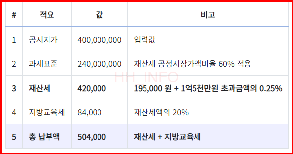 이때의 재산세 과표 금액은 4억 원 x 60% = 2억 4,000만 원이 되겠죠.