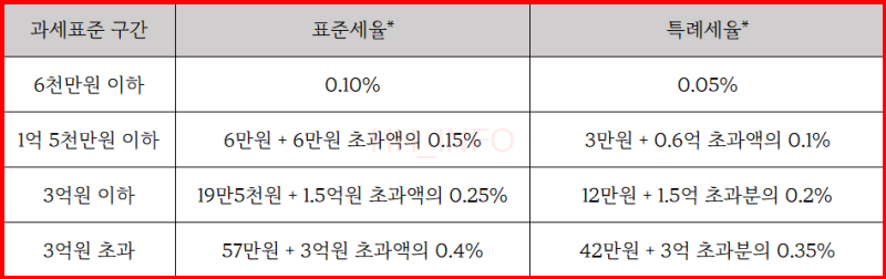 표준세율은 과표에 따라 0.1% ~ 0.4% 가 적용됩니다. 1주택자의 경우 특례가 적용되어 0.05%p 씩 빠진 0.05% ~ 0.35%까지 적용되죠. 특례세율은 공시가격 9억 원 이하인 주택에만 적용되는 점은 참고하세요.