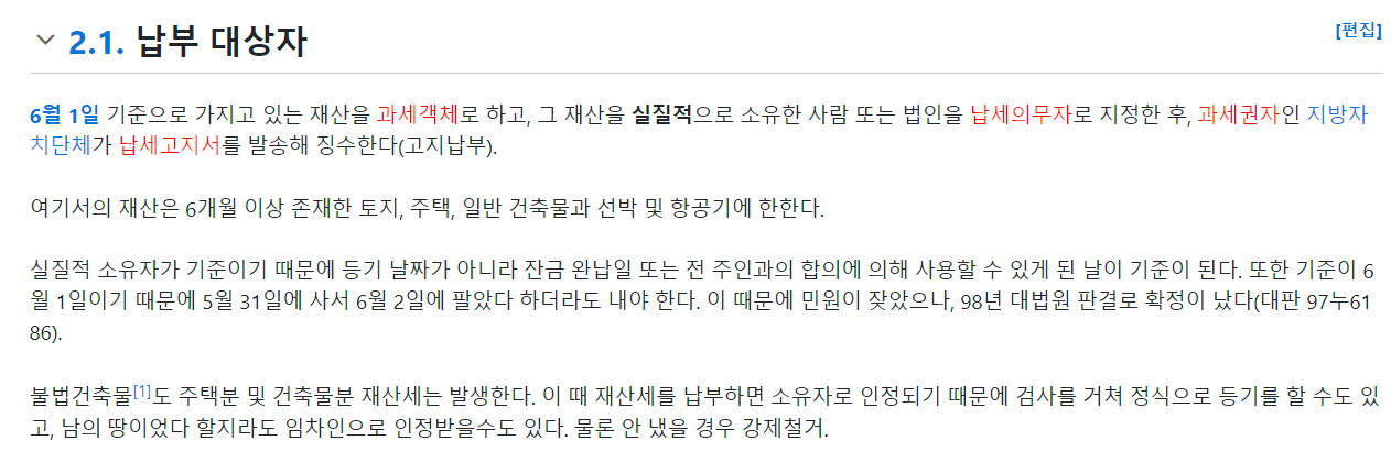 매년 6월 1일을 기준으로 그날 집을 보유하고 있는 사람이 납세 의무가 있습니다.