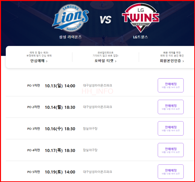 - 예매 방식: KBO 주관 포스트시즌 예매는 멤버십 적용 없이 모두 동일한 조건으로 진행됩니다.